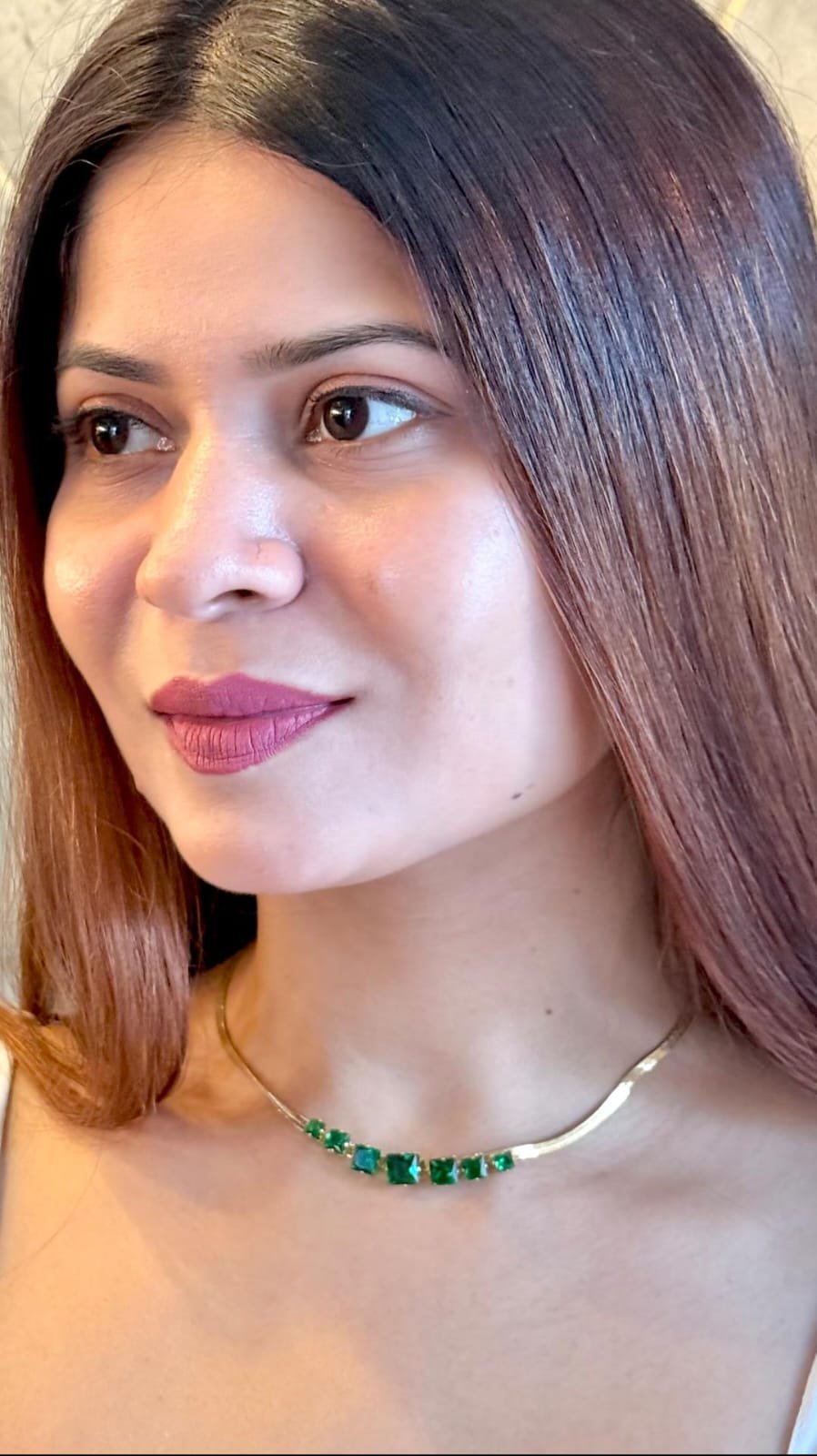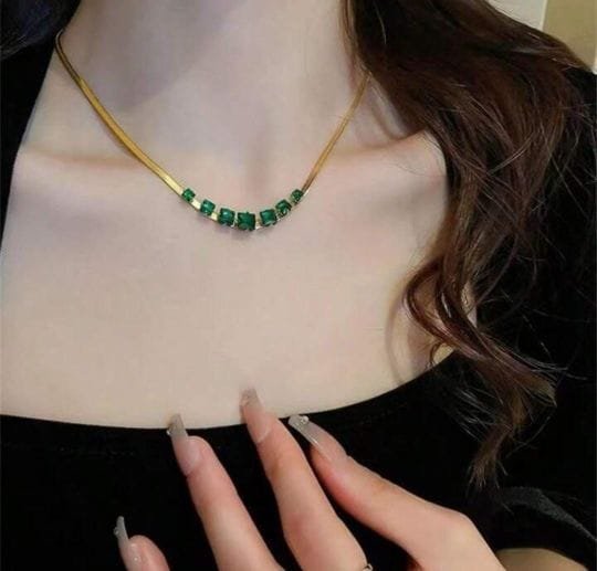 Bring timeless charm to your jewellery collection with the Emerald Elegance Gold-Plated Necklace. Designed with precision, this exquisite piece features a sleek gold-plated chain adorned with seven radiant emerald-green square-cut stones that sparkle with every movement. Perfectly balanced between modern design and traditional grace, the necklace is lightweight yet durable, making it comfortable to wear throughout the day. Whether you’re dressing up for a festive celebration, a wedding occasion, or simply want to elevate your evening attire, this necklace adds a vibrant pop of colour and sophistication. Crafted for women who appreciate elegance, this jewellery piece makes for a thoughtful gift or a personal indulgence. Pair it with ethnic outfits or contemporary western wear to leave a lasting impression.