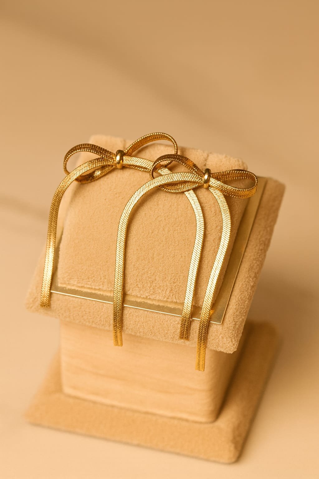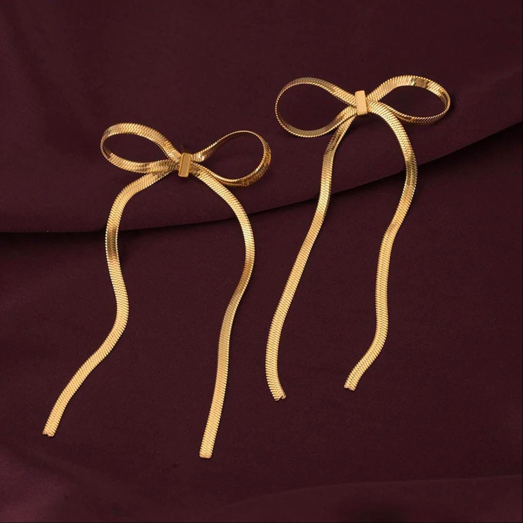 Elegant gold bow-knot ribbon earrings crafted with anti-tarnish stainless steel—lightweight, feminine, and perfect for everyday luxury.