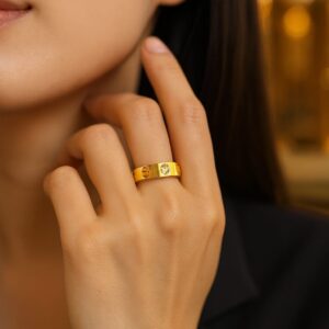 Make a bold yet understated statement with our sleek gold-tone band ring. Carefully crafted to balance simplicity and sophistication, this versatile piece adds a polished edge to your everyday outfits while embracing a minimalist design ethos. Whether you’re heading to the office, accessorizing your weekend look, or exploring creative stacking options, this ring effortlessly adapts to your unique style.