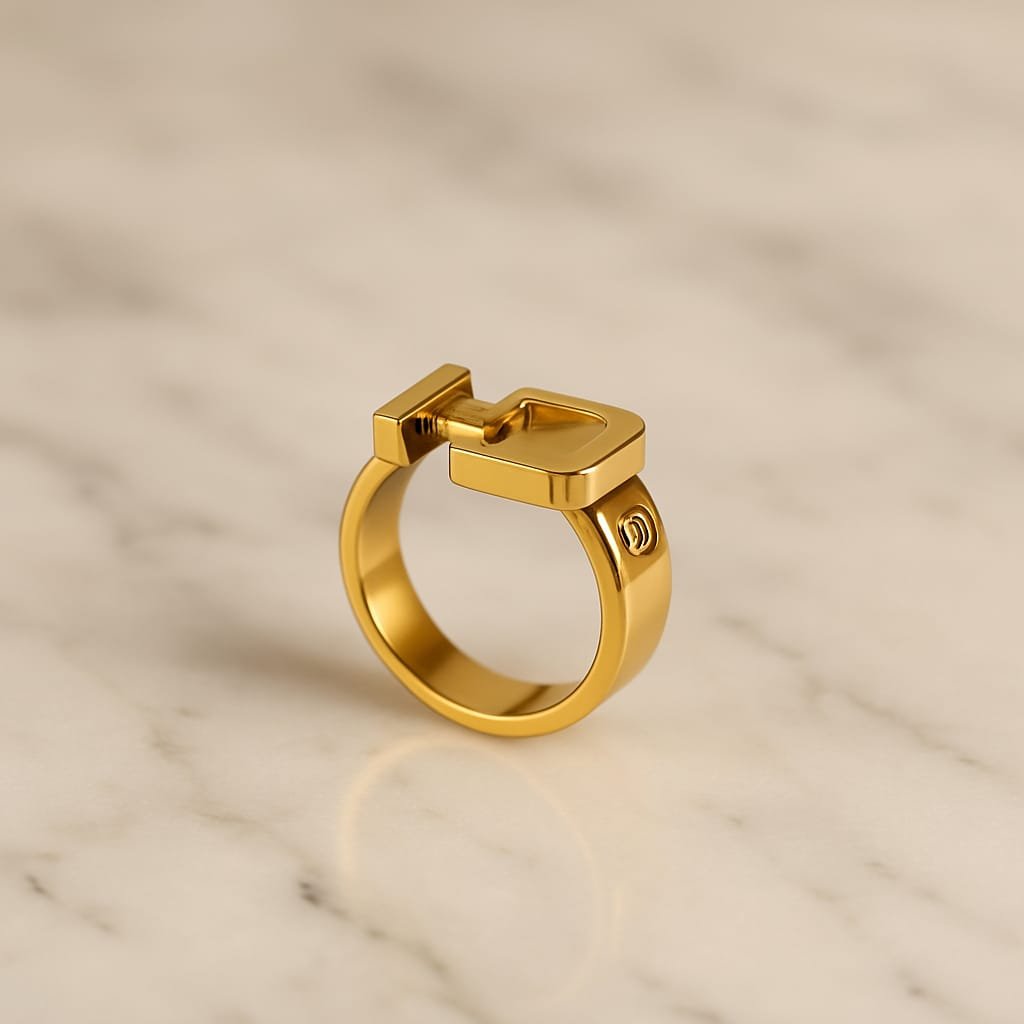 Made from premium-grade gold, the statement gold ring combines impeccable craftsmanship with durability. The refined buckle-style locking design ensures a secure fit while adding a touch of modern artistry to the classic gold aesthetic. Its polished finish exudes a radiant glow, making it the ideal accessory for those who appreciate timeless luxury with a contemporary twist.