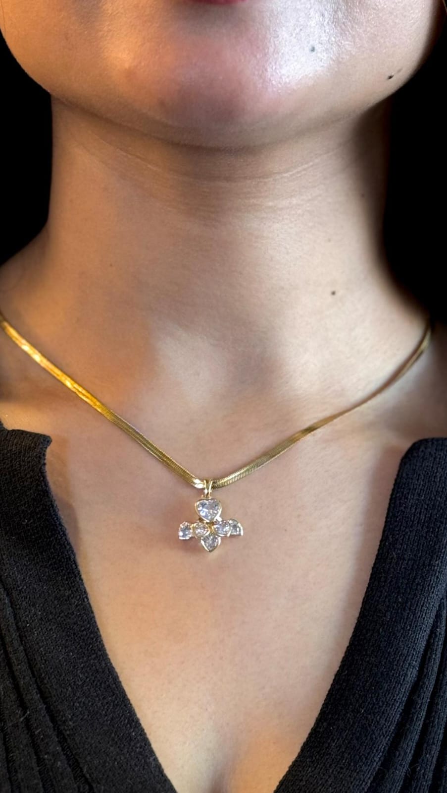 The Celestia Heart Bloom Pendant Necklace by Sioura Jewellery is a graceful expression of elegance and modern femininity. Designed with a delicate gold-toned chain, this pendant features a charming floral cluster of brilliant heart-cut stones that shimmer beautifully with every movement. The centerpiece design forms a subtle blooming pattern, symbolizing love, beauty, and timeless sophistication.