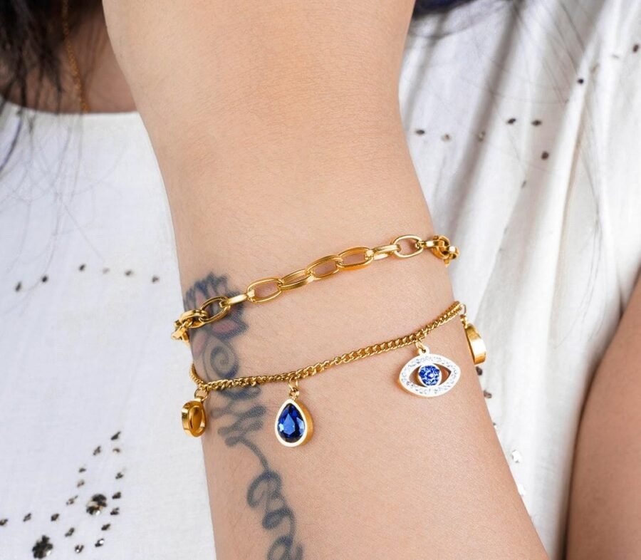 Featuring a dual-layer chain, this bracelet radiates a chic designer aesthetic that effortlessly enhances your look. The Evil Eye charm serves as both a stylish centerpiece and a symbol of protection, making it a distinctive addition to your jewelry collection. The teardrop-shaped blue crystals are delicately arranged to catch the light and create a mesmerizing sparkle, adding depth and vibrancy to the design. Every element has been carefully curated to balance refinement and trendiness.
