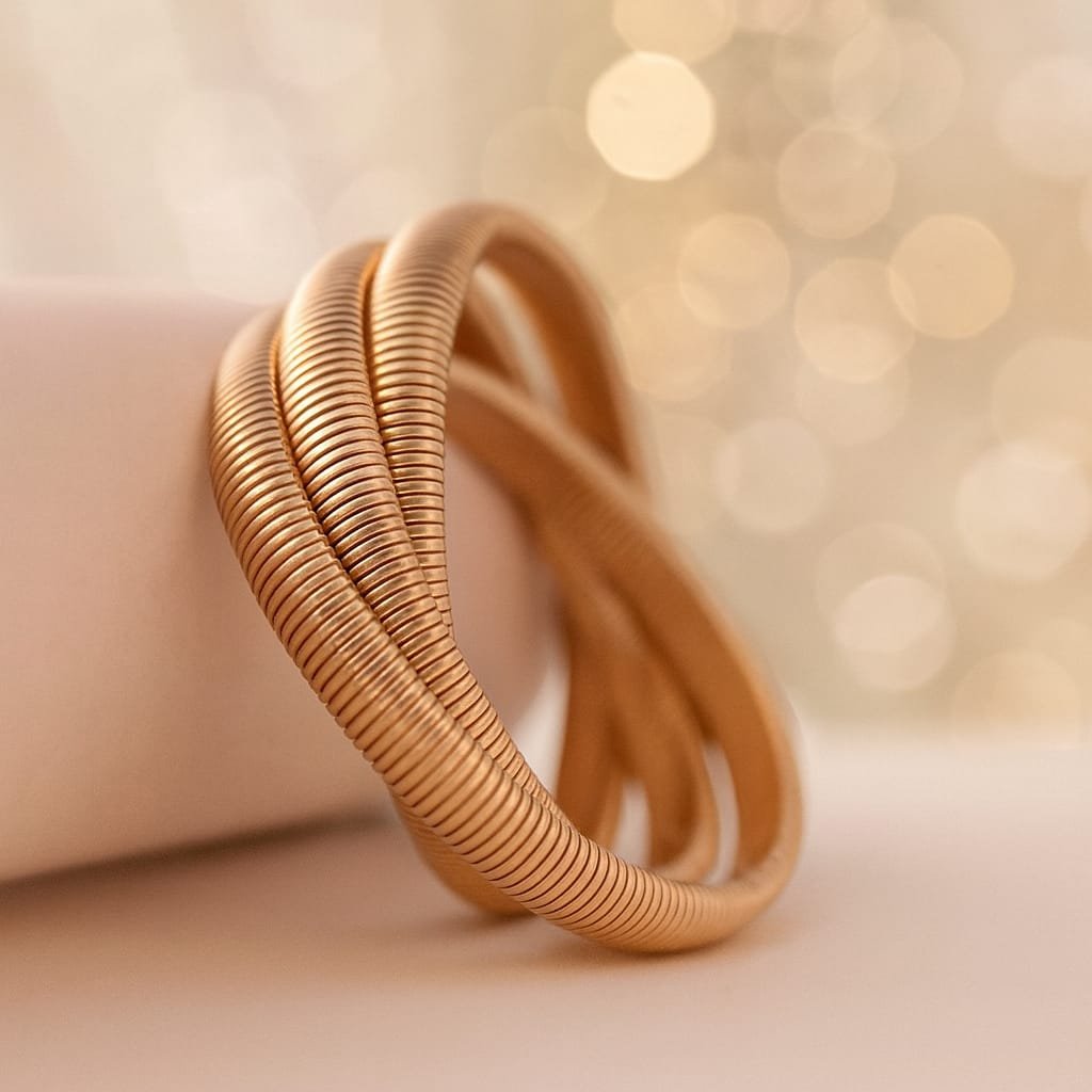 This elegant bangle set features a unique snake-chain inspired design in a rich gold-tone finish. Crafted with a flexible coiled texture, these bangles create a bold yet sophisticated look that wraps gracefully around the wrist. Their smooth metallic shine and contemporary style make them versatile enough to pair with both ethnic and western outfits.