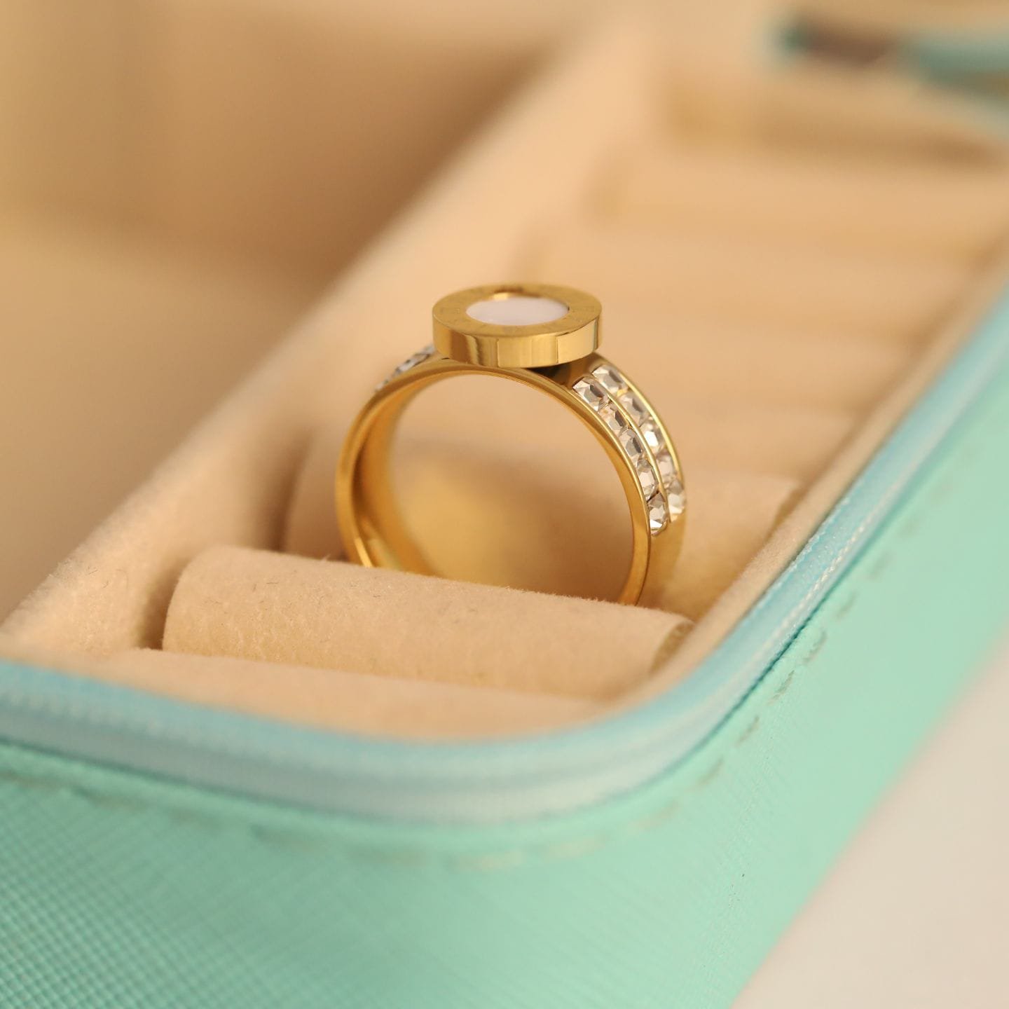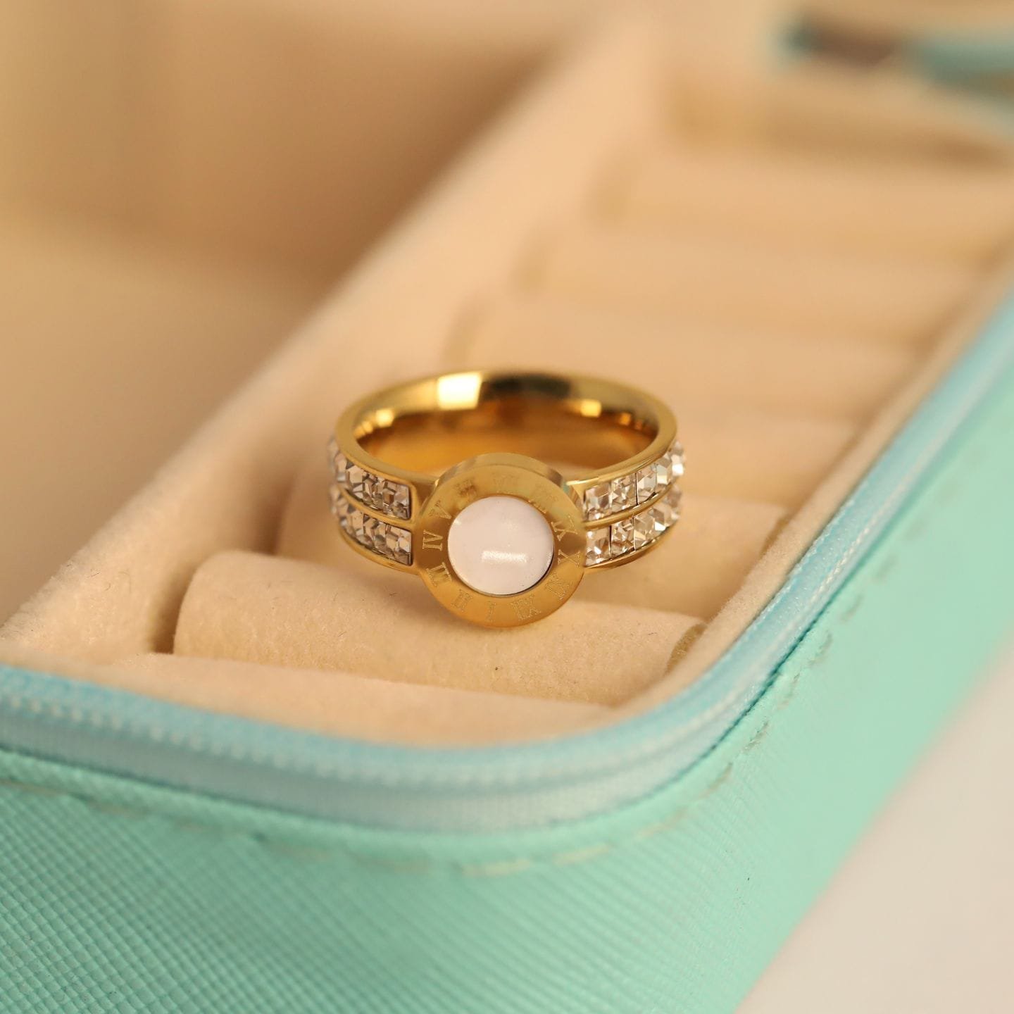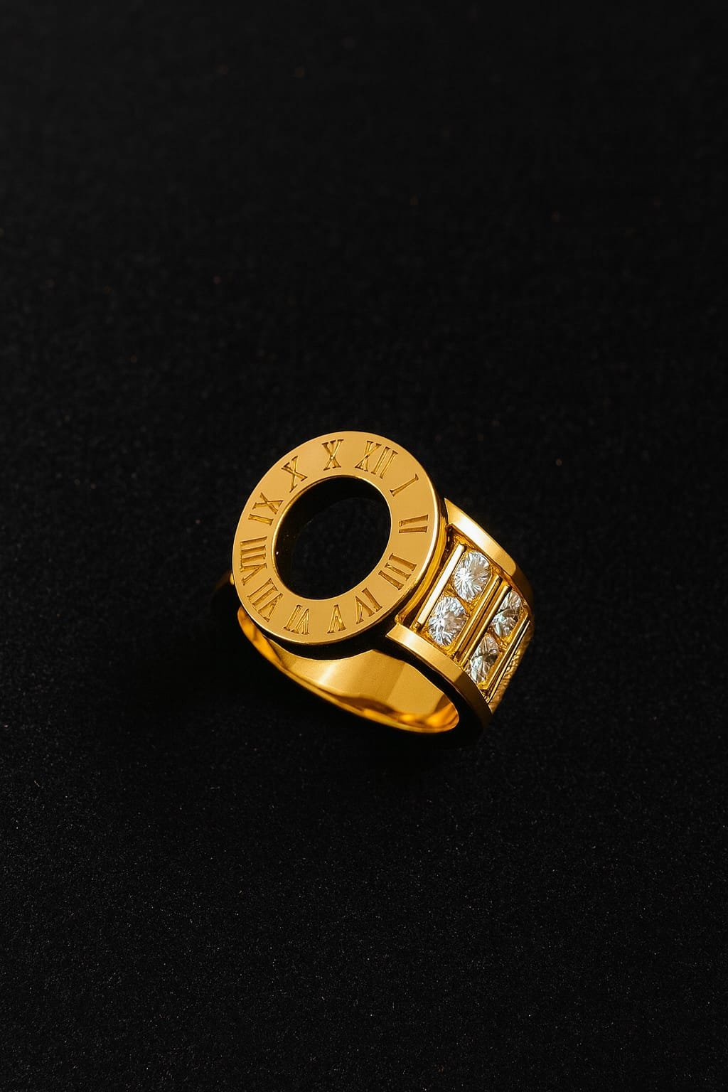 What sets this ring apart is its thoughtful amalgamation of elements that convey luxury and versatility. The dual-band structure adds a unique aesthetic that catches the eye, while the central white enamel dial serves as a focal point of intrigue. This dial features Roman numeral detailing, merging timeless classical motifs with modern design elements. The interplay of the crystals’ sparkle against the pristine enamel creates a harmonious, refined appeal suitable for any style enthusiast.