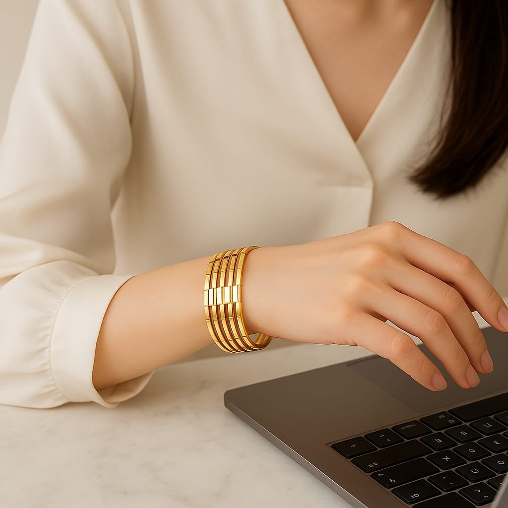 Rooted in nature, refined for luxury – the Bambu Luxe Cuff Bracelet brings the tranquil strength of bamboo into modern fashion. Inspired by the graceful nodes of bamboo stems, its sculpted design wraps around the wrist like a symbol of balance and resilience. The golden curves mirror the fluidity of nature while the open cuff ensures comfort and ease of wear. Its minimalist shape makes it perfect for stacking or wearing solo as a statement piece. Hand-finished with a rich, long-lasting gold tone, this piece belongs in every mindful, modern woman’s collection. Perfect for day-to-night transitions, resort wear, or meaningful gifts.
