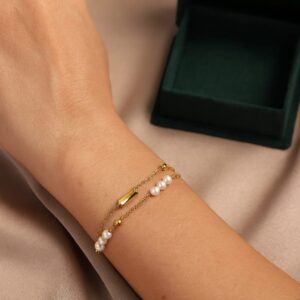 The double-strand configuration creates a layered effect, adding dimension and character to your wrist. The gleaming gold-tone finish perfectly complements the luminous pearls, creating a harmonious blend of contemporary charm and classic beauty. Meanwhile, the striking rectangular crystal accent serves as a subtle statement piece, catching the light with every movement to ensure you sparkle effortlessly throughout the day.