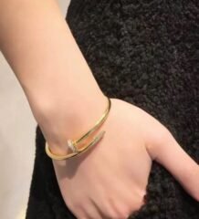 This elegant designer-inspired bangle is crafted in a sleek gold-tone finish, featuring a dual-band open design for a modern and stylish look. At the center, it showcases a unique combination of a teardrop motif, a circular mother-of-pearl inlay, and sparkling crystal accents, giving the piece a luxurious and sophisticated appeal.