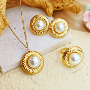 This premium jewelry combo set exudes timeless elegance with its classic gold-tone finish and luminous pearl centerpieces. The set includes: