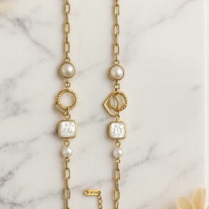 Introducing a chic gold-toned bracelet that perfectly blends sophistication and contemporary style. This stunning accessory features lustrous pearls and sleek geometric charms, making it a versatile addition to your jewelry collection. Whether you’re enhancing a casual ensemble or adding the final touch to an elegant outfit, this bracelet effortlessly elevates your look.