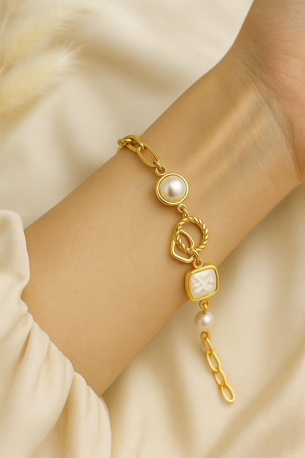 This bracelet isn’t just beautiful—it’s designed with comfort and durability in mind. The gold-toned finish lends a touch of luxury, while the secure clasp ensures it stays in place throughout the day. The pearls exude a subtle sheen, adding understated glamour, while the geometric charms introduce a modern edge, creating a harmonious balance between classic and contemporary design.