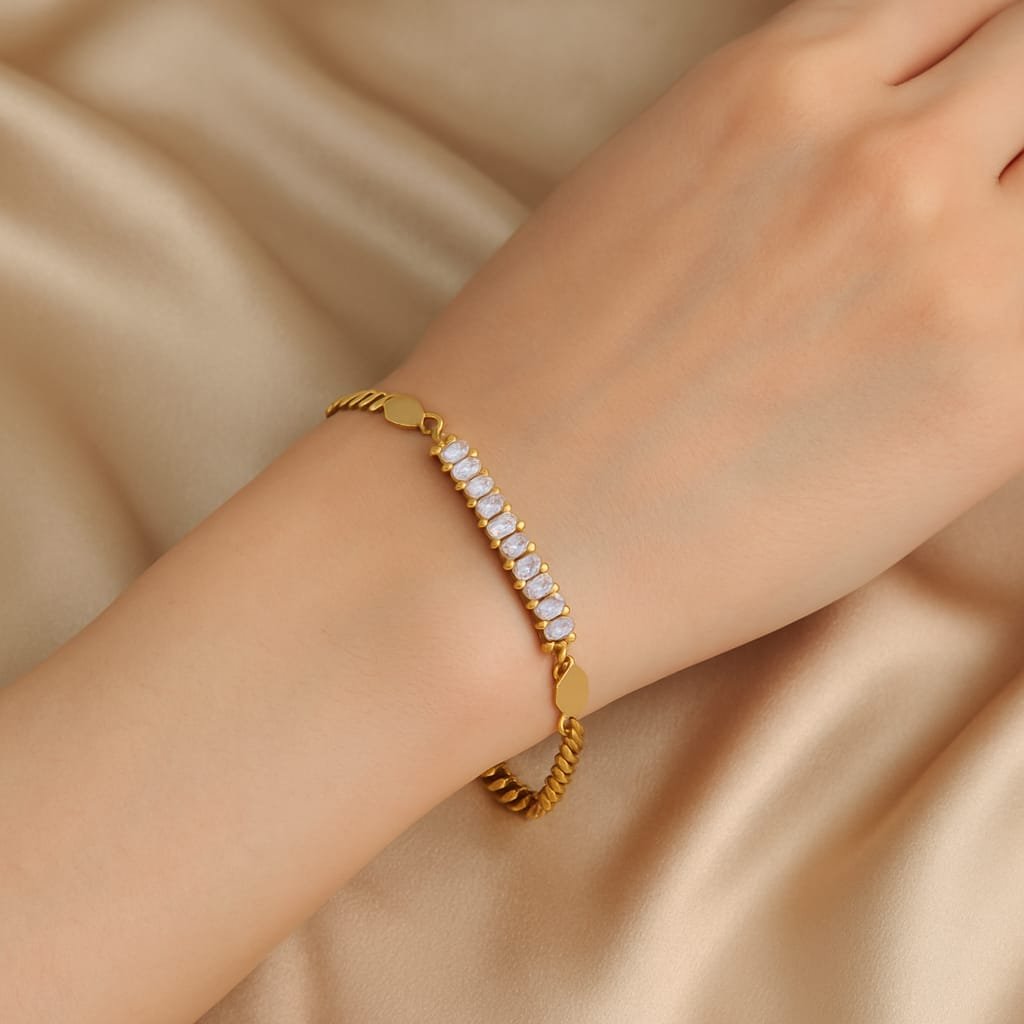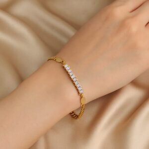 Feel the difference in quality with this exquisitely designed bracelet. The gold plating showcases a warm, lustrous finish while the baguette-cut zirconia stones offer unmatched sparkle and clarity. Each detail has been thoughtfully engineered for lasting durability, so you can enjoy this piece for years to come. Lightweight and comfortable, it’s suitable for daily wear or reserved for your most special occasions.