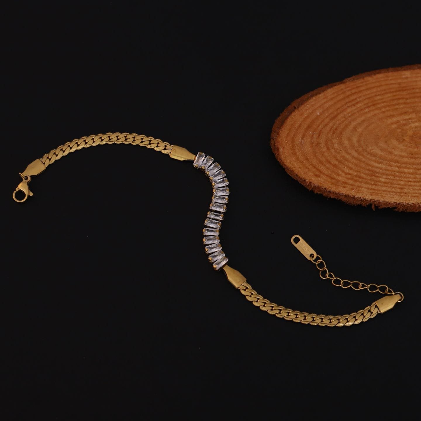 Indulge in the sophistication of the chic gold-plated bracelet, crafted to deliver both style and versatility. This stunning piece features a meticulous arrangement of baguette-cut zirconia stones that gleam brilliantly with every movement. Its chic design ensures a perfect balance of luxury and subtle glamour, making it the ideal accessory to elevate your look, whether casual or formal.