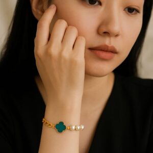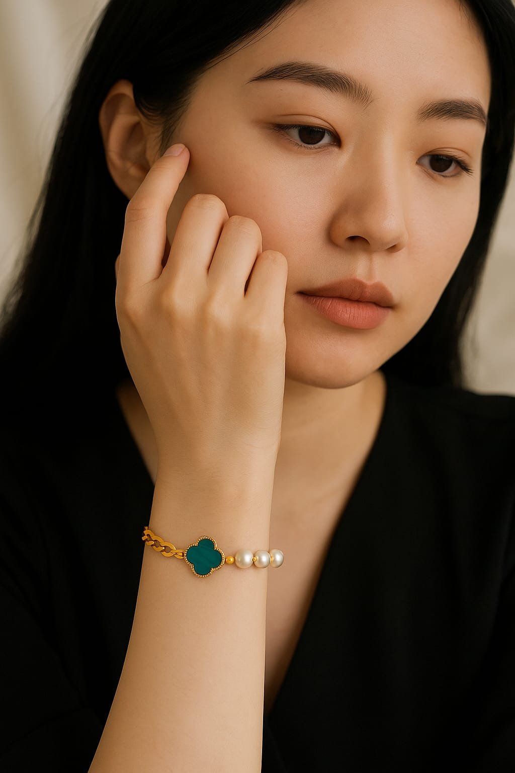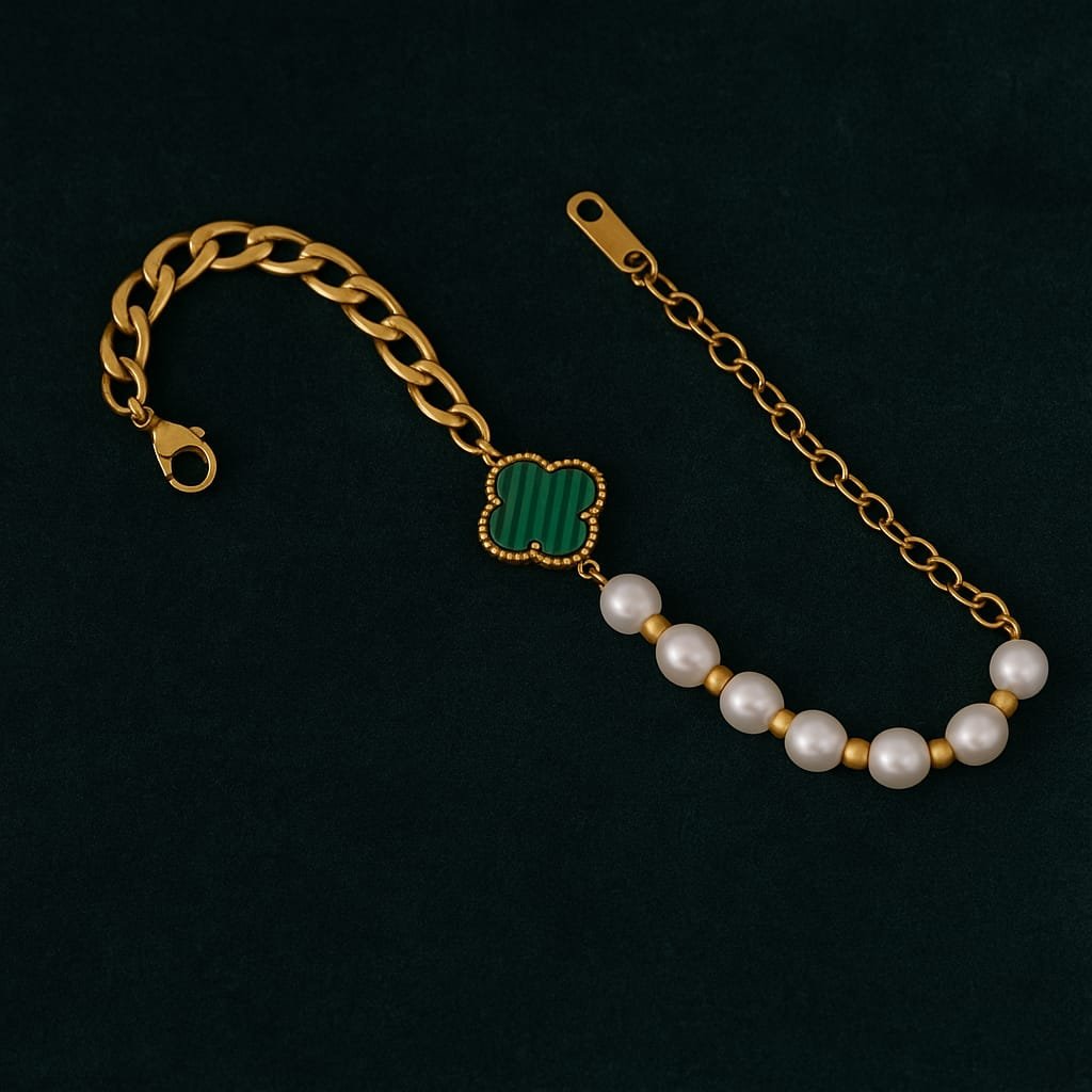 Every element of this bracelet has been carefully chosen to provide lasting beauty and quality. The intricate gold-tone setting highlights the luminous green clover charm, providing a refined yet lucky focal point. The pearls exude sophistication and elegance, while the sturdy chain link adds a modern, daring edge. This thoughtful fusion of textures and details creates a bracelet perfect for both everyday wear and special occasions.