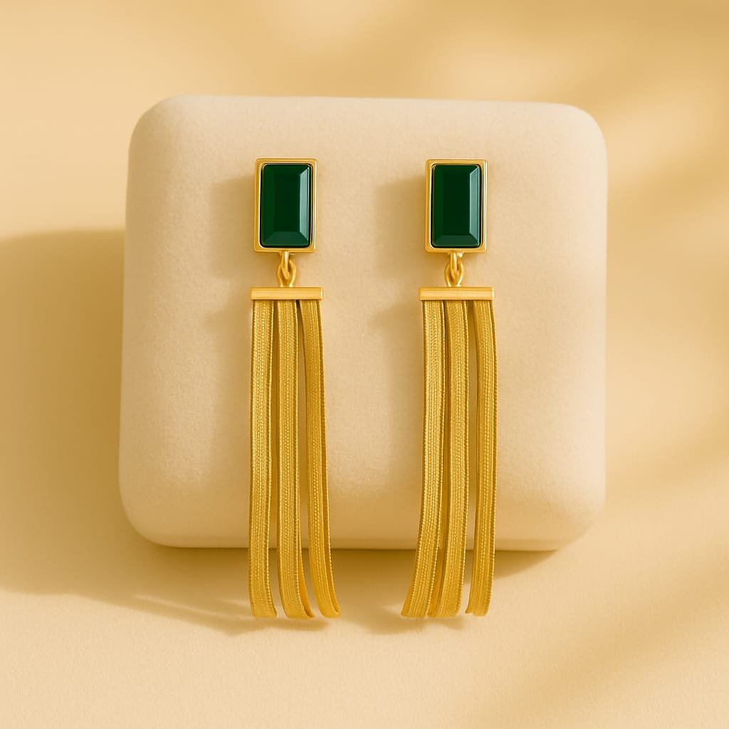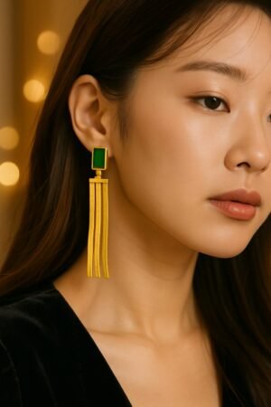 The Emerald Tassel Earrings are meticulously crafted to ensure quality and durability without compromising on style. The bold green stud symbolizes confidence and individuality, making these earrings a perfect choice for those who love standing out. The golden tassels cascade gracefully, featuring a delicate movement that catches the light beautifully. This combination of textures and colors creates a stunning harmony that complements any outfit, from a formal dress to a chic casual ensemble.