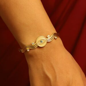 This graceful bracelet is designed with a unique golden disc centerpiece featuring an elegant evil eye motif, symbolizing protection and positivity. The bracelet is adorned with delicate wave-like dual straps, accented with tiny shimmering stones that enhance its luxurious appeal. Its minimal yet striking design makes it a versatile accessory suitable for daily wear as well as festive occasions. Comfortable and lightweight, this bracelet effortlessly combines tradition with modern style, making it a perfect keepsake or a meaningful gift for loved ones.