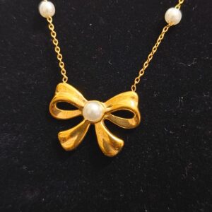 The Golden Pearl Bow Neck Set brings a soft and sophisticated charm to your jewellery collection. Designed with a delicate gold-tone chain, this neckpiece is adorned with evenly spaced faux pearls and finished with a central bow-shaped pendant that features a pearl at its heart. Its minimal yet festive design makes it ideal for traditional wear, parties, or even as a gift for special occasions.
