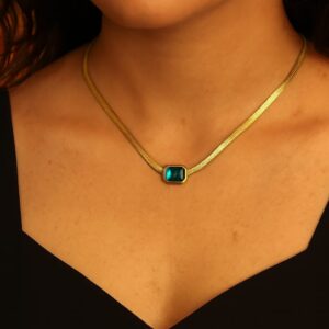 Add a touch of modern elegance to your look with the Korean Minimal Emerald Pendant Necklace. Featuring a sleek gold-plated snake chain, this necklace is highlighted by a single emerald-green rectangular stone that exudes sophistication and class. The minimal design is inspired by contemporary Korean jewellery trends, making it an effortless accessory for both casual and formal outfits. Lightweight and versatile, it can be styled alone for a chic minimalist vibe or layered with other chains for a bold statement look. Perfect for gifting or adding to your own jewellery box, this piece redefines understated luxury.