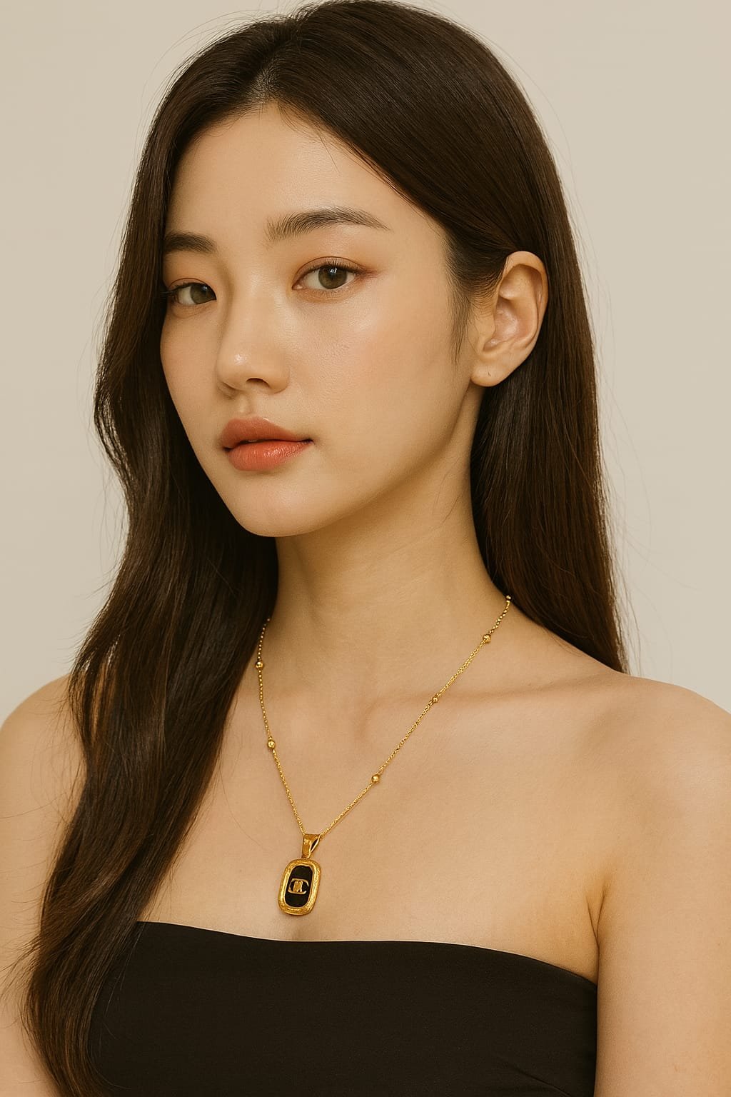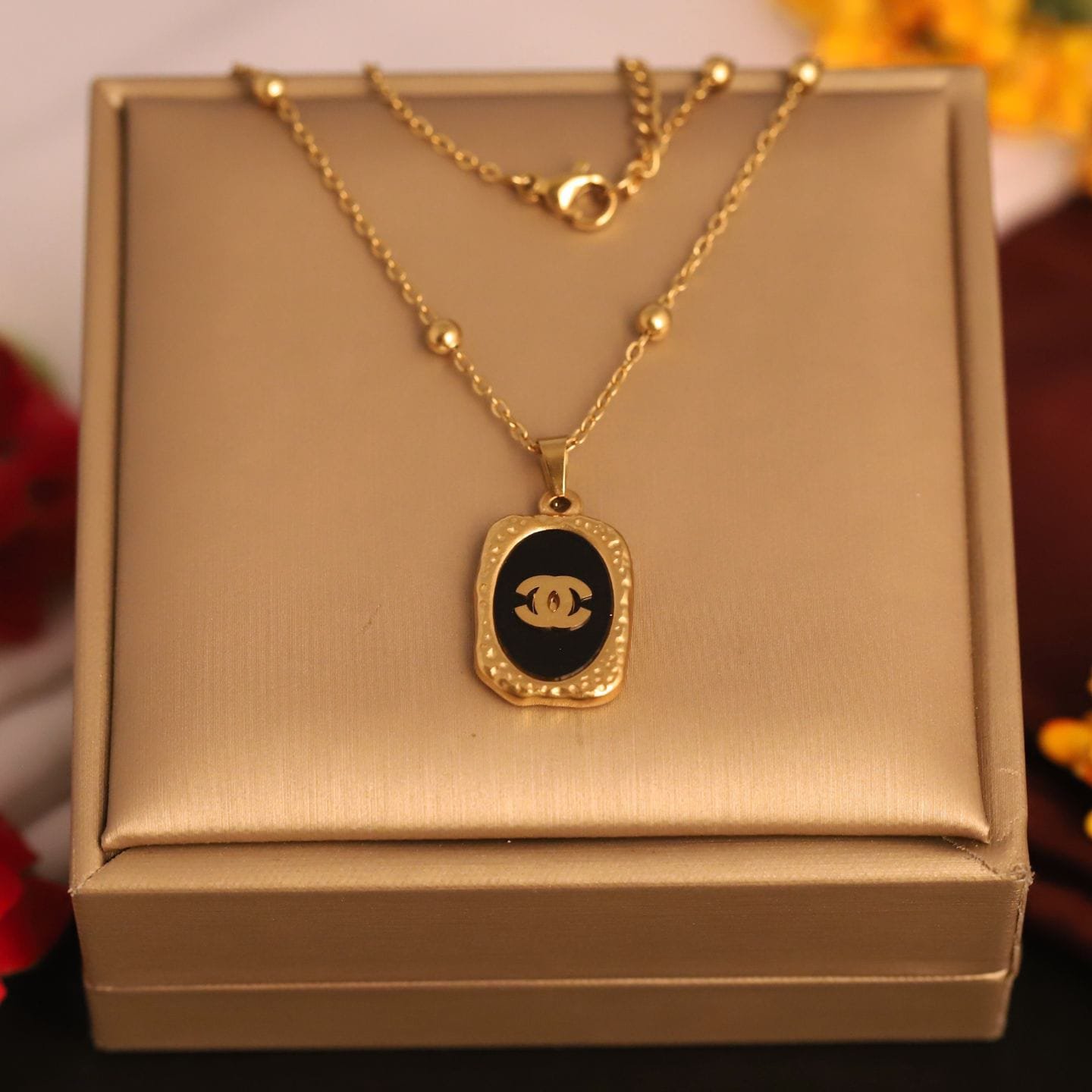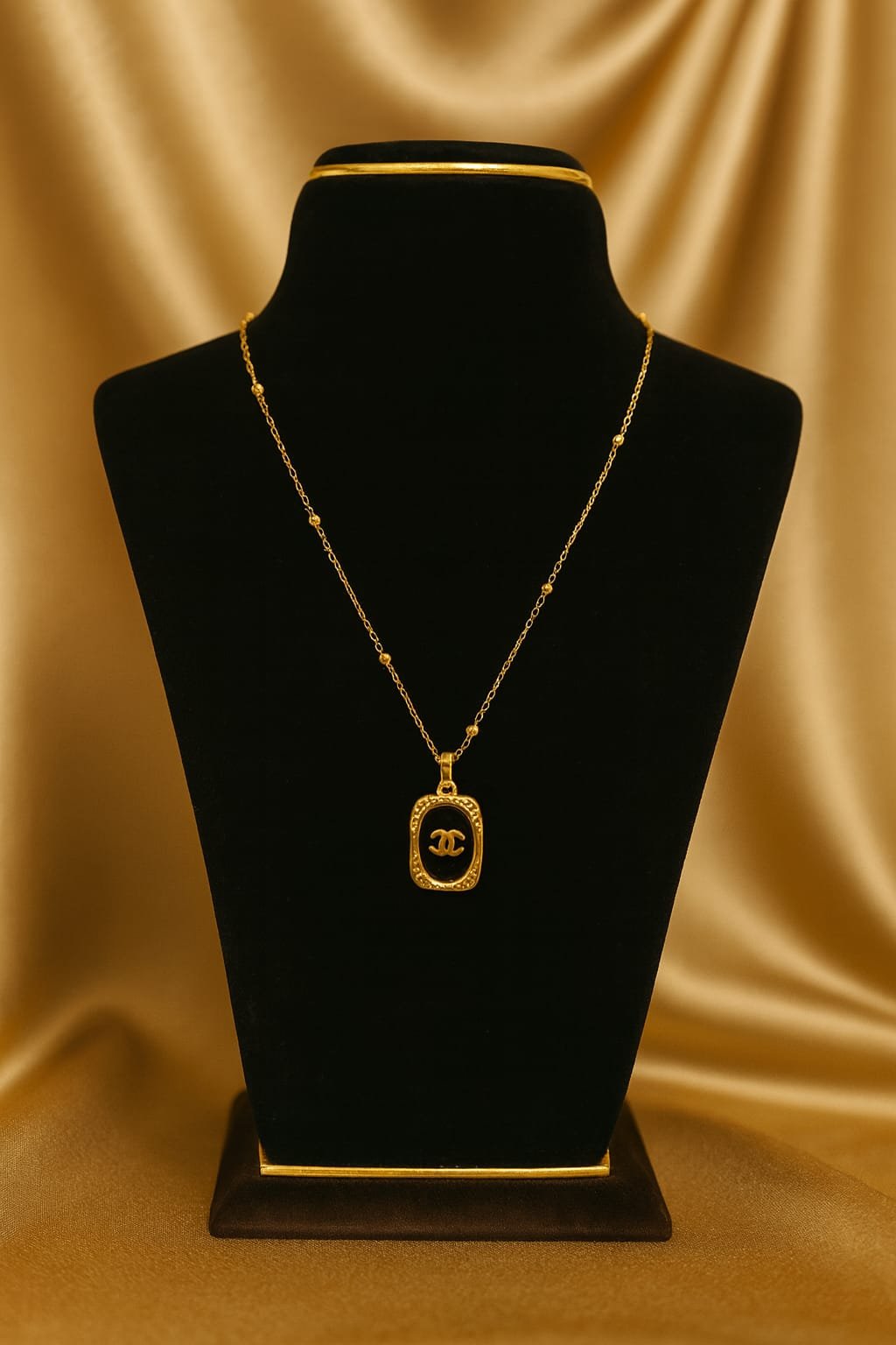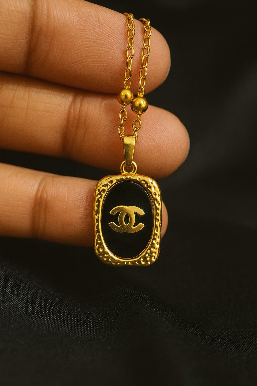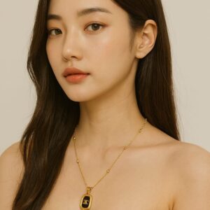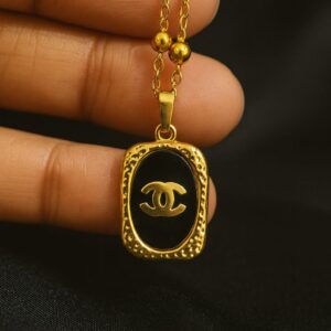 This Luxury-Inspired Black & Gold Emblem Pendant Chain brings a premium touch to everyday fashion. The sleek gold-plated chain is adorned with a rectangular pendant showcasing a glossy black enamel center and a bold designer-style “CC” emblem. The frame of the pendant is beautifully detailed with a textured golden border, adding a rich, high-end appeal.