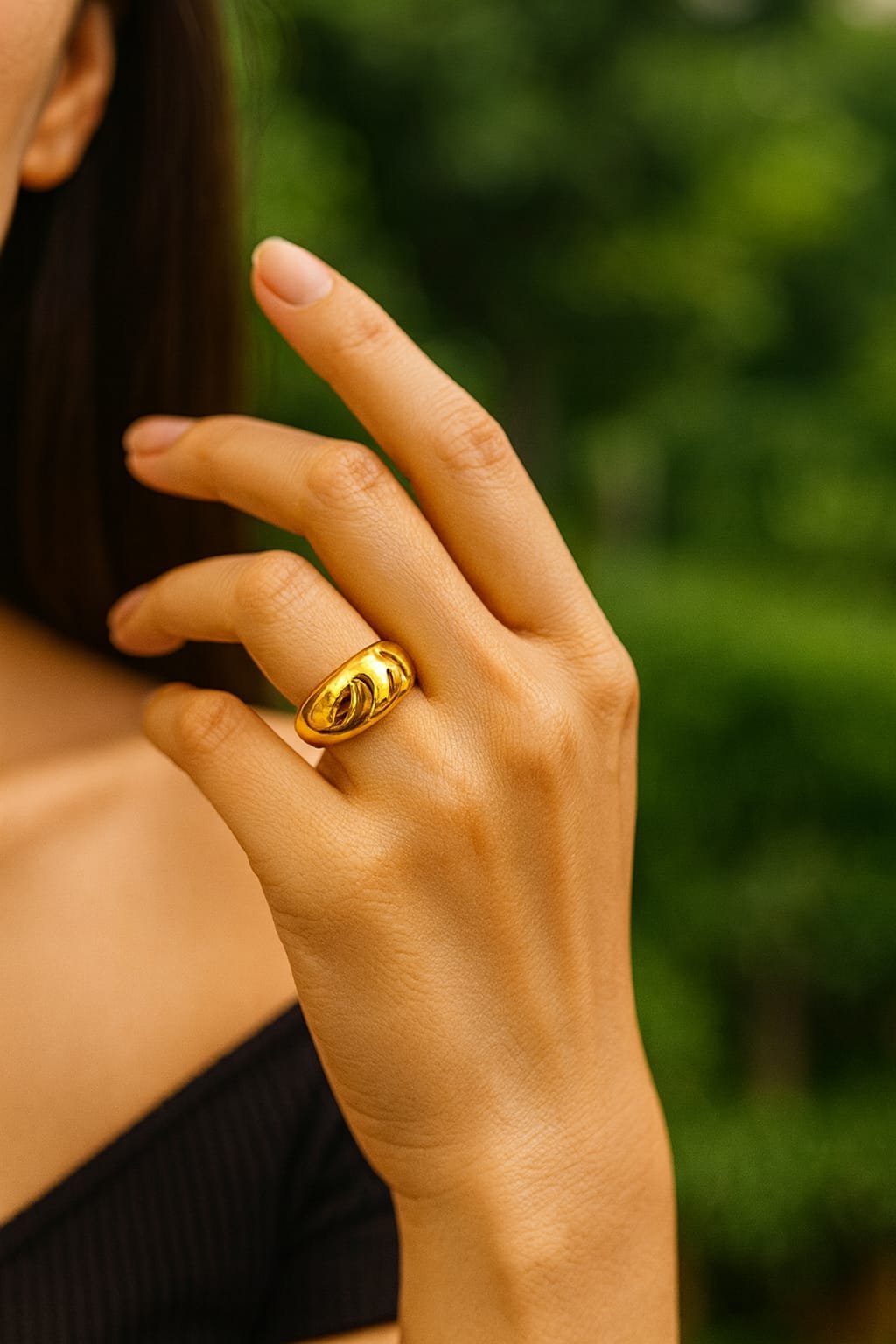 Crafted with precision and care, this dome ring embodies the perfect balance of bold sculptural edges and refined elegance. Its high-shine finish adds a luxurious touch, while the molten-texture detailing ensures the design remains unique and captivating. This combination makes it a standout piece that complements a variety of outfits, making it worthy of attention whether paired with evening wear or casual attire.