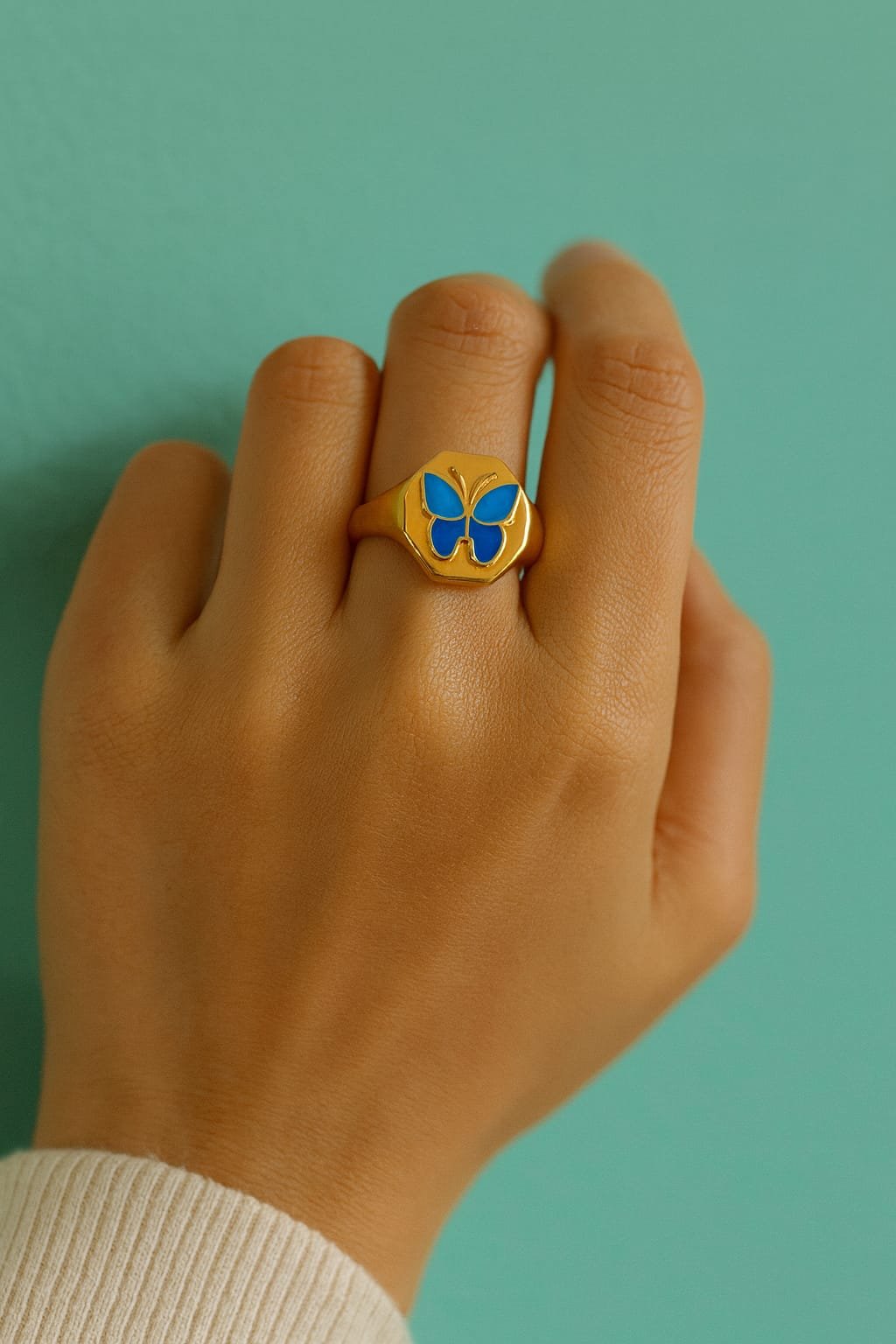 The butterfly design is meticulously embossed in vibrant blue enamel, combining bold colors with exquisite detail to create a piece that stands out. The finish highlights the intricate patterns on the butterfly’s wings, making it the focal point of the ring. Crafted with durable materials, this piece is built to last, offering both beauty and longevity. With its lightweight yet robust build, it guarantees comfort without compromising on quality.
