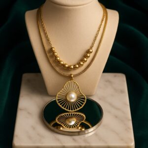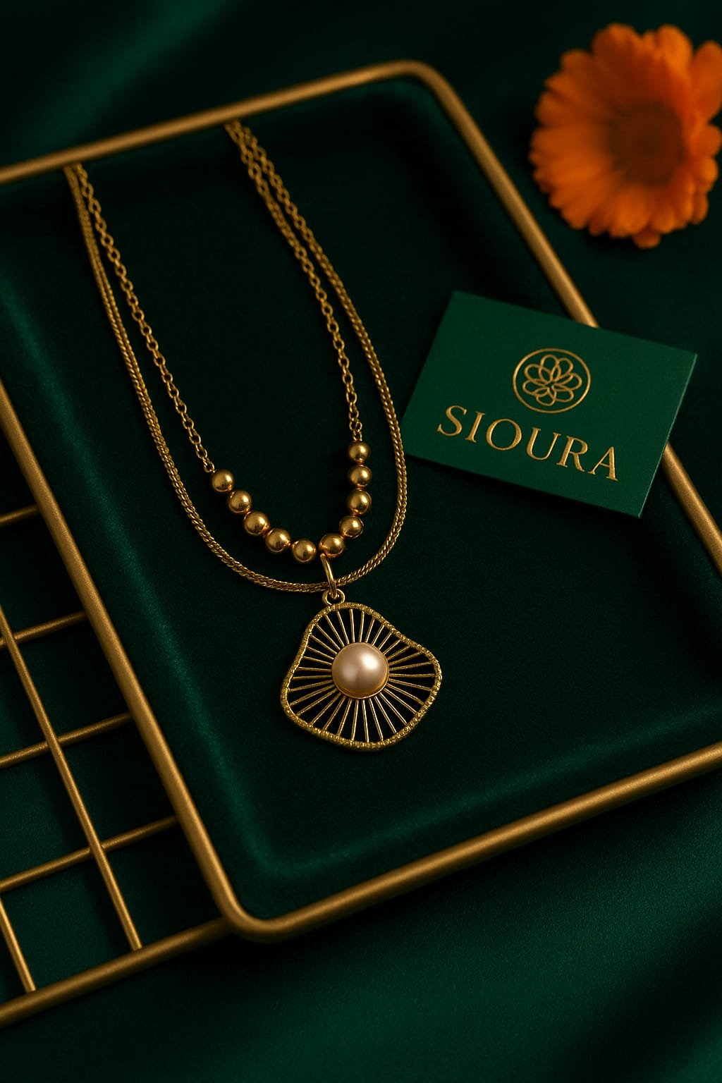 Elevate your accessory game with this exquisite layered gold-tone necklace set. Perfectly designed to blend vintage charm with modern sophistication, this set features a beaded chain paired with a striking pendant. The fan-shaped rays surrounding a central pearl create a show-stopping centerpiece, embodying elegance that complements any outfit or occasion.