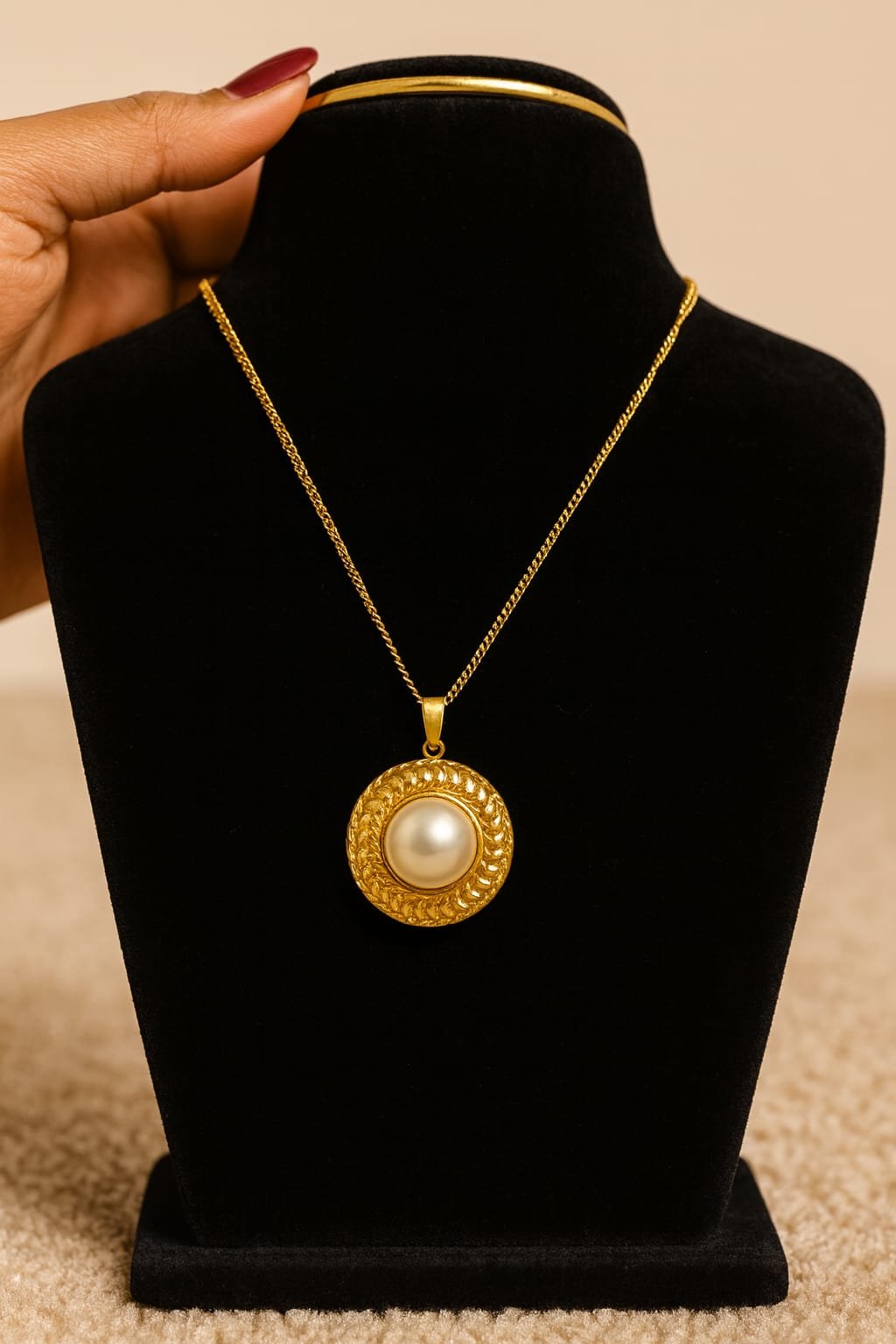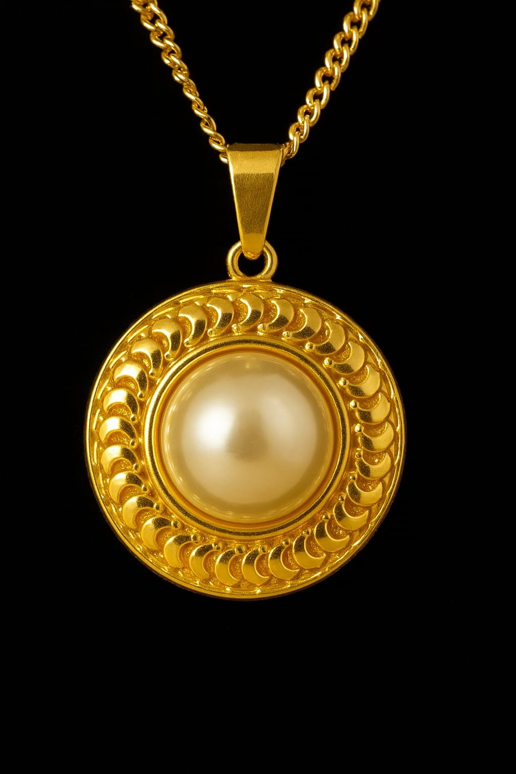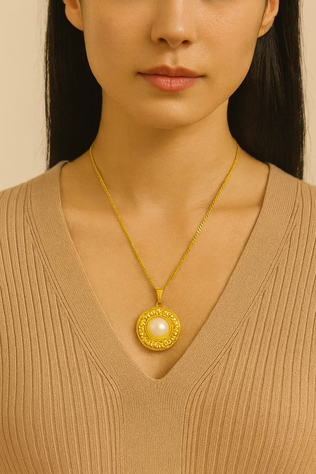 Make a powerful statement with this Regal Pearl Medallion Necklace. Designed to capture timeless beauty, the pendant showcases a large faux pearl set within an ornate circular gold medallion, featuring textured detailing that adds richness and depth. The necklace is suspended on a fine gold-toned chain, creating a graceful silhouette perfect for both traditional attire and modern ensembles. Its bold, royal-inspired design makes it an ideal choice for festive occasions, weddings, or when you simply want to stand out with poise and elegance. Comes with a secure clasp for easy wear.