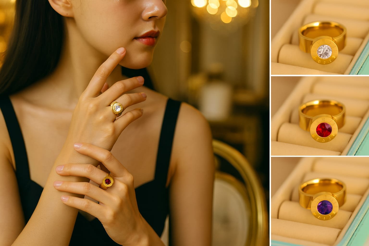 Crafted with a smooth gold-plated band and engraved with timeless Roman numerals, this statement ring offers interchangeable center gemstones – Citrine Yellow, Sapphire Blue, and Ruby Red – allowing you to match your mood, outfit, or aura with ease.