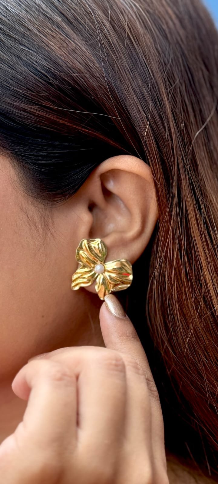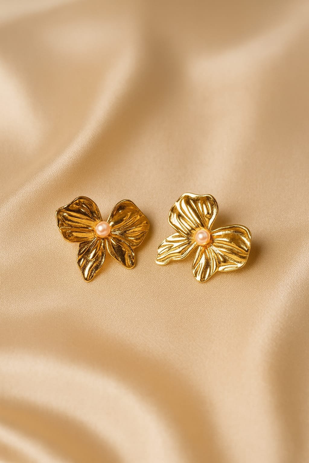 Introducing the Sioura Bow Pearl Gold Studs, a luxe Korean-inspired design crafted to elevate your everyday and festive look. These earrings feature delicately sculpted three-petal floral motifs in premium 18K gold-plated stainless steel, ensuring long-lasting shine and anti-tarnish durability. At the center sits a soft blush pearl, adding a touch of elegance and femininity.