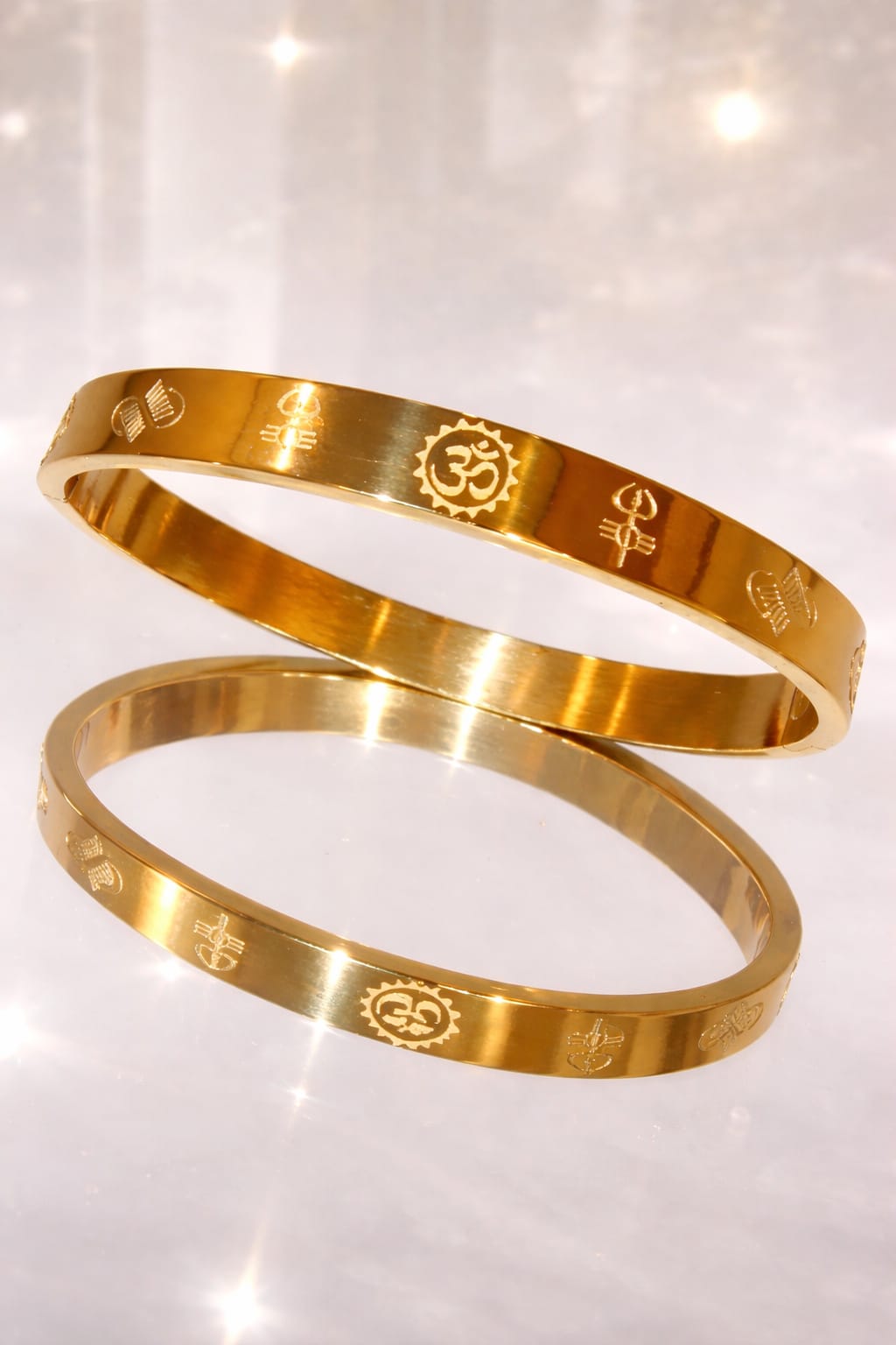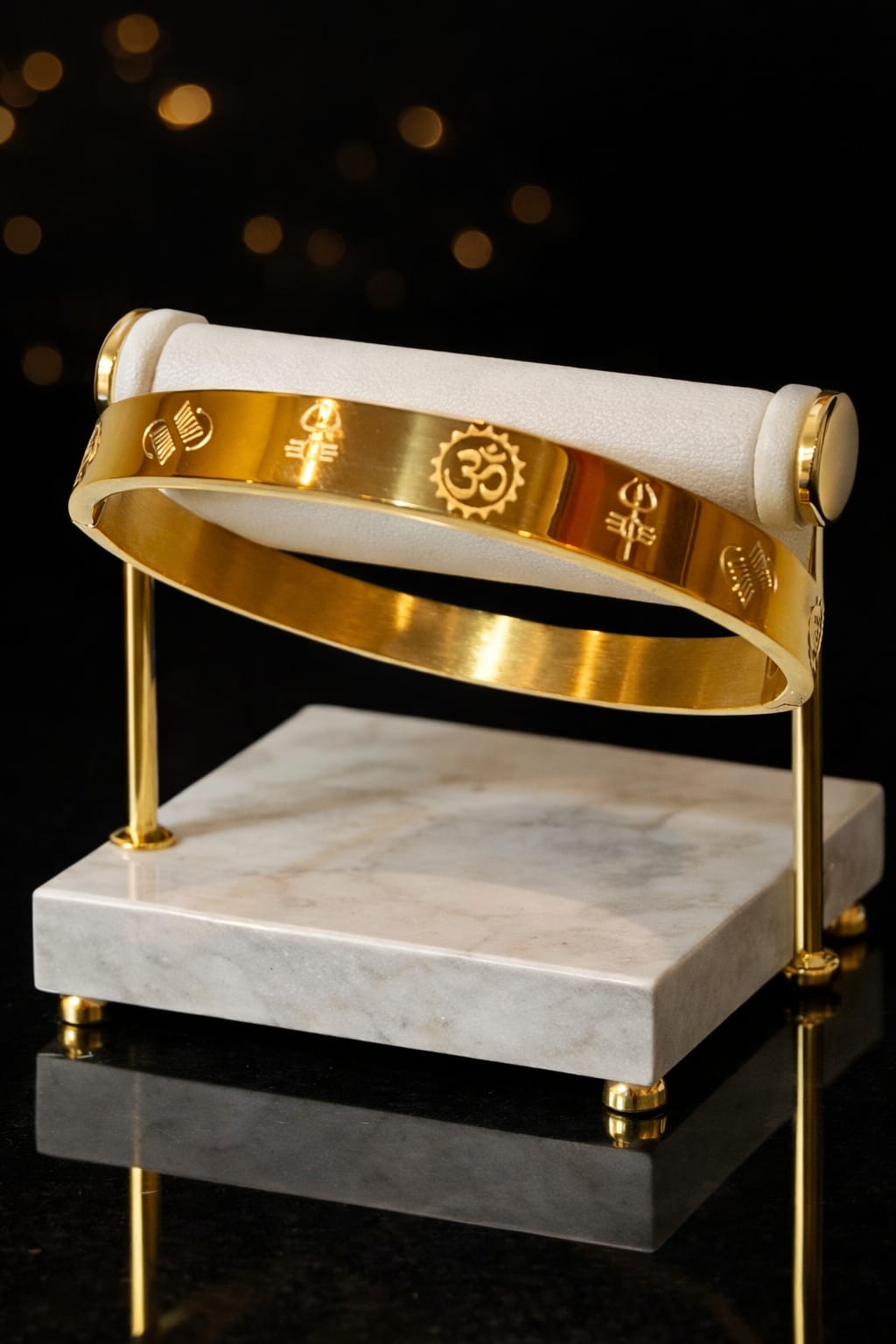 Celebrate faith and elegance with our Divine Om Trishul Kada, a timeless symbol of spiritual strength and positive energy. Crafted with a radiant gold-polish finish, this sleek kada features beautifully engraved sacred symbols including Om, Trishul, Shankh, and divine motifs that represent protection, power, and prosperity.