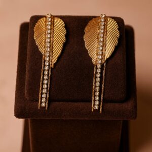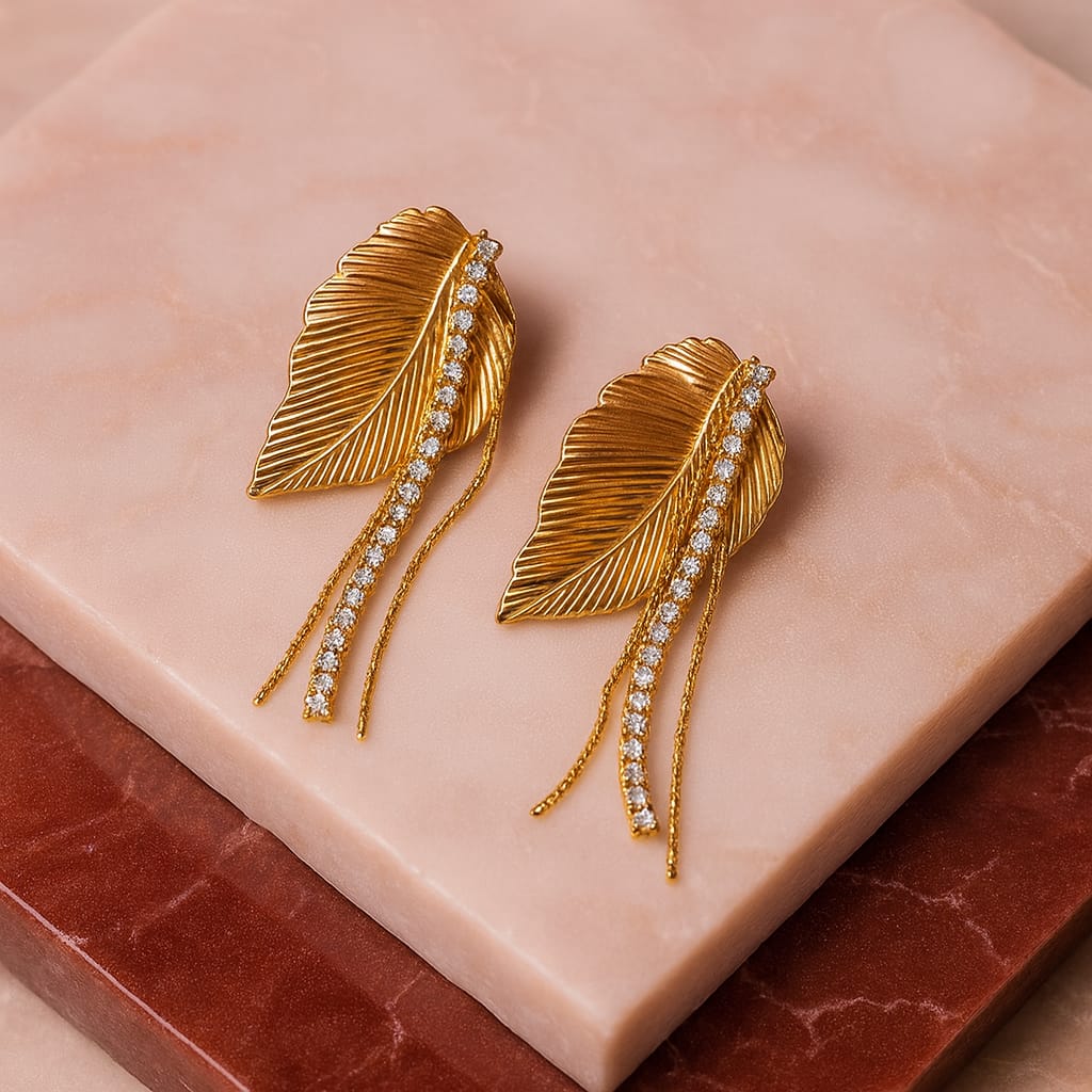 Elevate your elegance with the Sioura Golden Leaf Luxe Danglers, beautifully crafted in premium gold-polished stainless steel. These statement earrings feature intricately carved leaf motifs paired with a shimmering cascade of high-grade cubic zirconia stones.