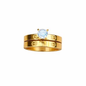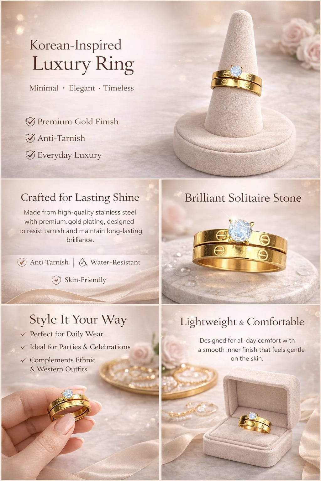 A premium gold-finish Korean-style solitaire stack ring with an anti-tarnish, elegant, and everyday-luxury design.