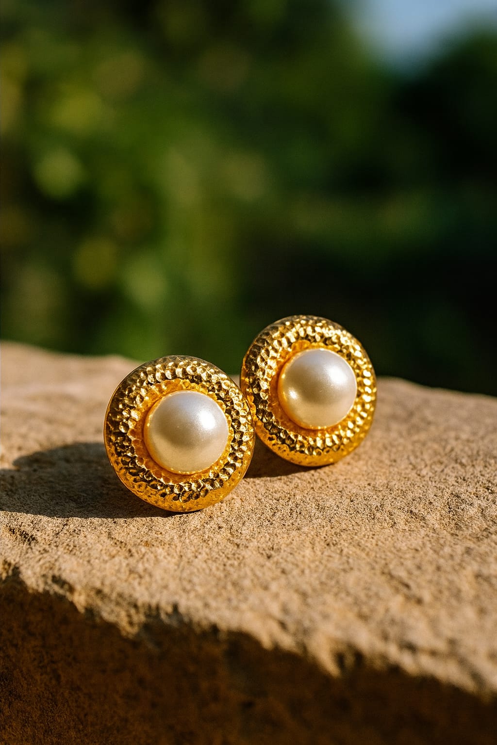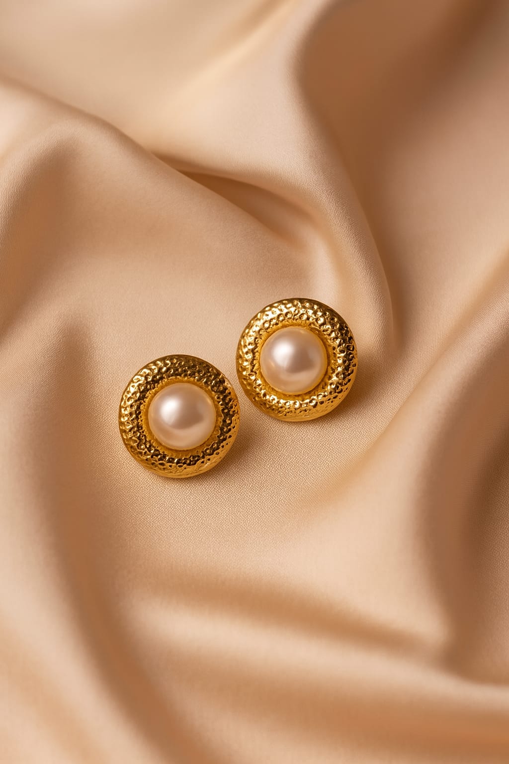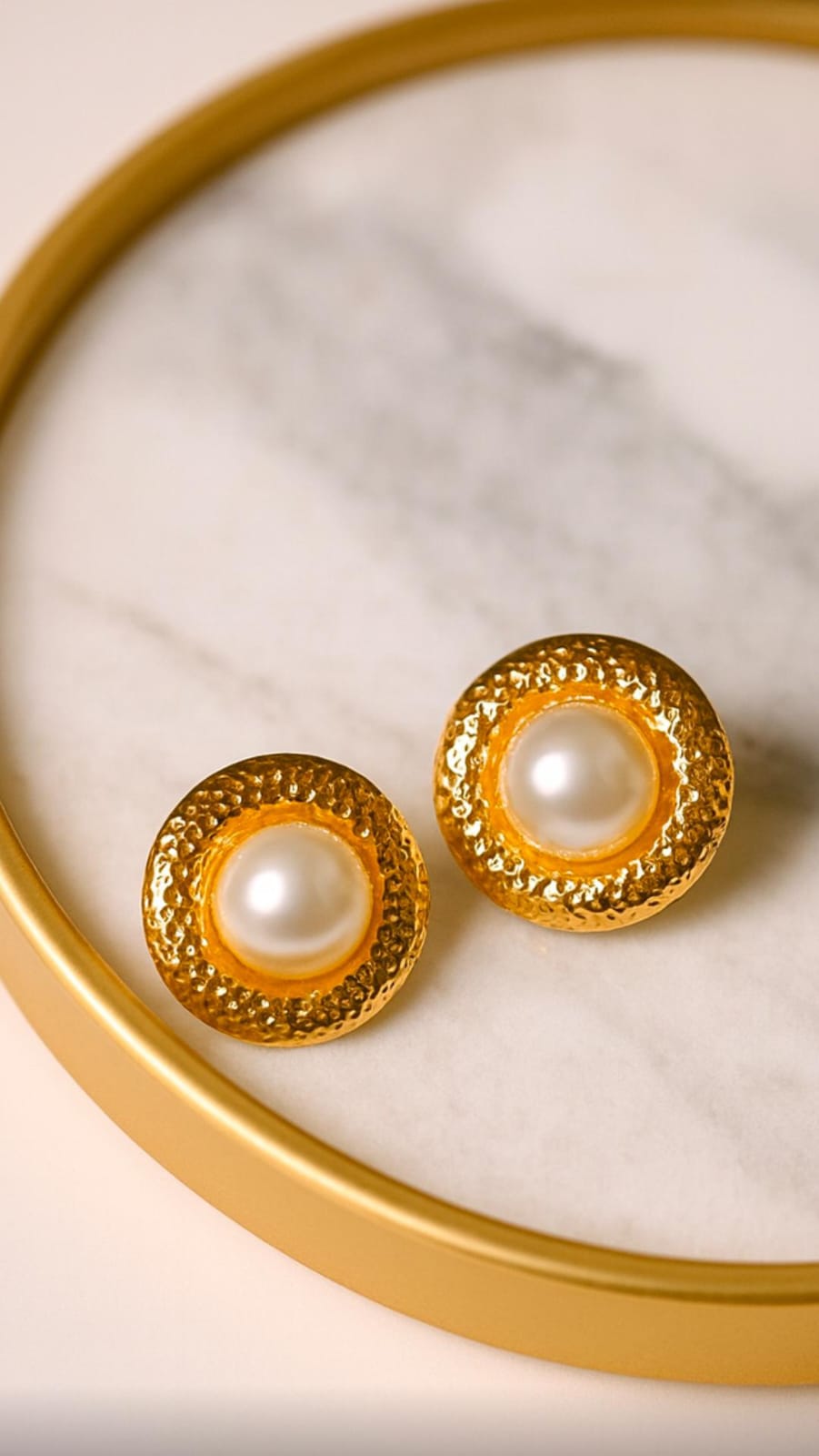 Experience elegance in its purest form with Sioura’s Imperial Textured Pearl Studs, designed to bring a royal touch to your everyday style. These stunning earrings feature a luminous premium pearl set at the center, surrounded by a beautifully handcrafted textured gold circular frame that reflects light with every movement.